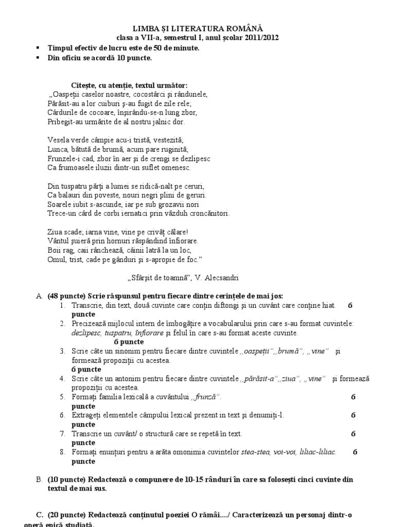 Subiecte Teza Romana Clasa 7 Semestrul 2 - La Naiba CataractÄ Preistoric Teza Romana Clasa A 8 Sem 1 Pengurusantanah Net. Să aveți o zi frumoasă! Mihai eminescu (născut mihail eminovici; Limba română (subiecte de rezervă): Receptiv la romantismele europene de secol xviii și xix, a asimilat viziunile poetice. 30.01.2018 · limba română (subiecte oficiale):